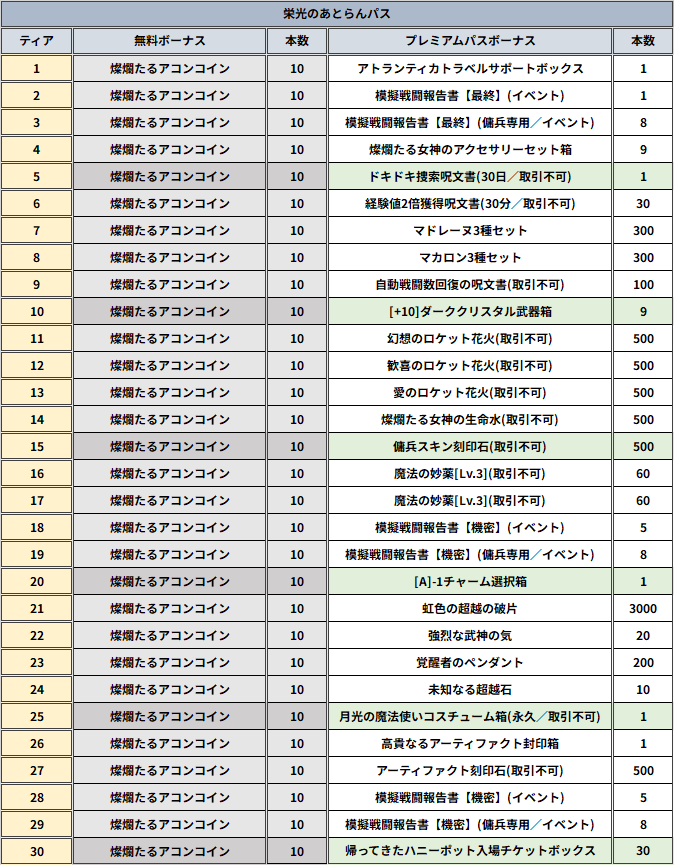 誤解してた分も含めて、パスは2系列だが、プレミアムパスは復帰、既存新規でどちらか片方だけ貰える。で見た感じ復帰よりも既存新規の方が幾らか報酬良いのがある。(未知なる超越石が半分の5、武神の気も半分の10、A-1チャームが選択がランダム箱になってるのと取引不可の表記がない、その他花火や消耗品の幾つかも数が少ないね。復帰じゃなくて、既存にしとくだけで報酬増えるんだからーメンテまでに1回ログインしとくべきだな。)無料ボーナスは両方貰えるので全部やると10x30x2でアコンコイン600個